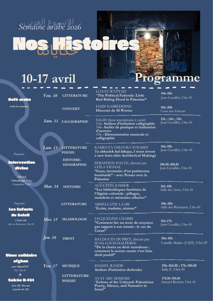 Initiée en 1998 dans l’intention de nourrir les réflexions sur les langues et les cultures arabes, la Semaine arabe de l’ENS est un événement académique et culturel qui se tient chaque année au printemps et qui réunit, une semaine durant, chercheur·euses,